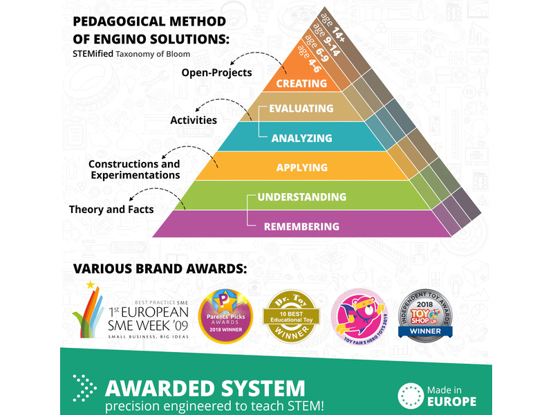 Engino pomáhá dětem rozvíjet kritické myšlení, prostorovou představivost a koordinaci ruka-oko již od 1.5 roku. Učí je spolupracovat, hledat řešení problémů a aplikovat teorii v praxi. Pro pedagogy i rodiče Engino nabízí kompletní výukový systém STEM, který pokrývá širokou škálu vědeckých principů a podporuje učení prostřednictvím hraní. Engino se pyšní bezpečností a ekologickými hledisky.