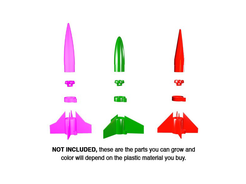 Balení obsahuje: trubky, vložky motorů, vytahováky, padáky (22.9 cm) atd., k tisku je doporučena hmota ABS.