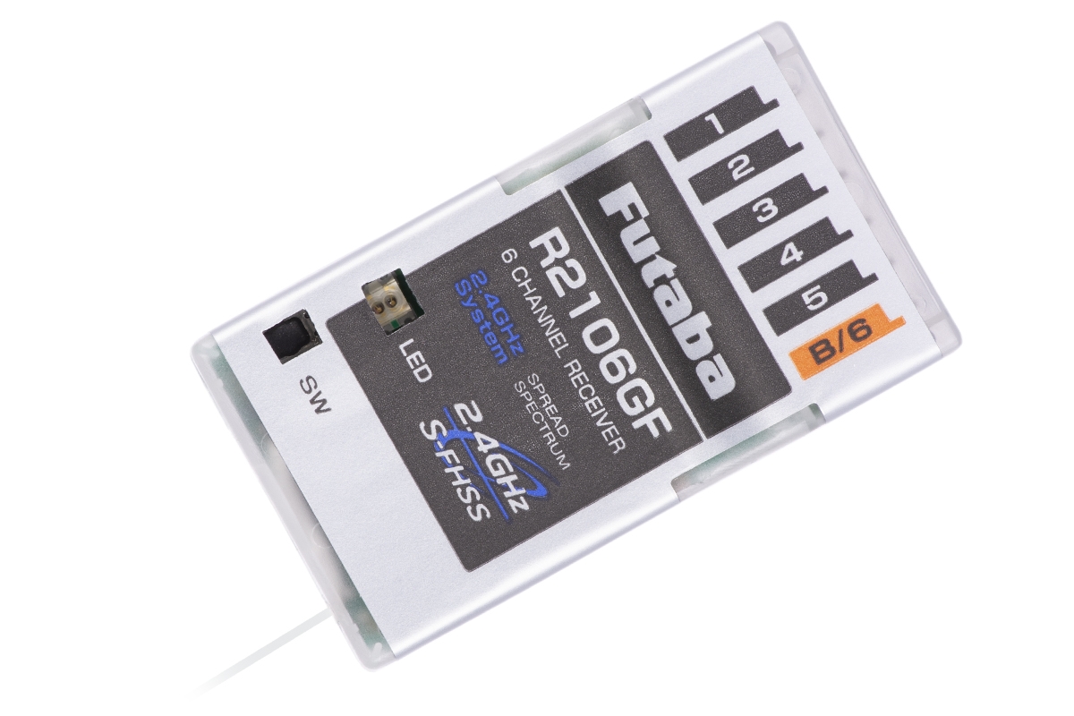 Šestikanálový přijímač Futaba přenosového systému S-FHSS/FHSS 2.4GHz bez telemetrie s omezeným dosahem. Je určen pro použití v malých a lehkých modelech letadel nevyžadujících velký dosah (park-flyerech a slow-flyerech) a podobných aplikacích. R2106GF je vybaven 6 PWM kanálovými výstupy pro klasická serva. Provozní stavy přijímače jsou signalizovány LED indikátorem.