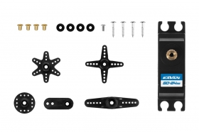Super rychlé digitální miniservo s kovovými převody s výstupní hřídelí uloženou na dvou kuličkových ložiscích pro použití v RC modelech všech typů. Plastová krabička.