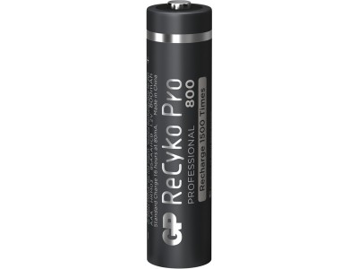 Nabíjecí NiMH akumulátor GP ReCyko Pro Professional HR03 AAA (mikrotužka) 800mAh je vhodný všude tam, kde jsou kladeny vysoké nároky na samovybíjení. Je proto vhodný např. pro napájení vysílačů, má vysokou životnost, umožní více než 1500 nabíjecích cyklů. Napětí 1,2V, rozměry 10,5 × 44,5 mm.