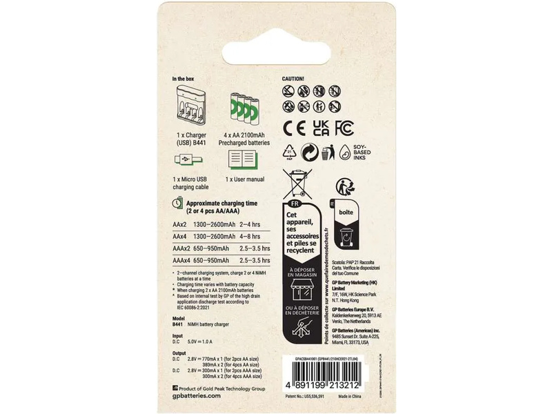 USB nabíječ Eco E441 na baterie GP. V balení 4ks akumulátorů AA GP ReCyko 2100mAh. Velmi malé rozměry nabíječe. LED indikace stavu nabíjení. Automatické řízení procesu nabíjení. Detekce poškozených akumulátorů. Nabíjení 2 nebo 4 baterií. 2 nabíjecí kanály. Nabití přiložených baterií přibližně za 6 hodin.