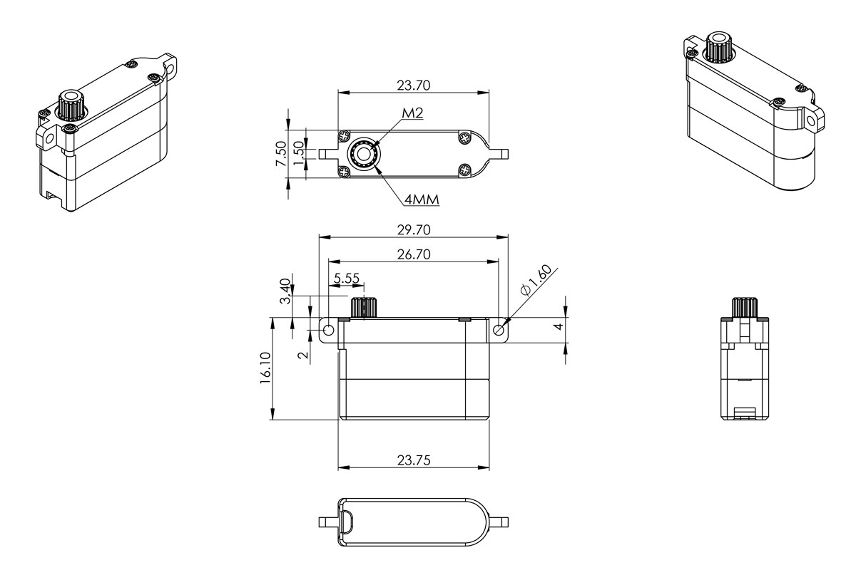 Silné a velmi rychlé programovatelné digitální mikroservo s titanovými převody s výstupní hřídelí uloženou ve dvou kluzných ložiscích; místo potenciometru je magnetický enkodér (Hallův senzor). Díky přesným předepjatým převodům s minimálními vůlemi a ploché krabičce s výškou 7,5 mm je zvláště vhodné pro ovládání křidélek a klapek v RC házedlech F3K, malých větroních a motorových modelech s tenkými profily křídla, jako jsou F5D modely pro závody okolo pylonů. Pro dokonalé chlazení i při vysokém zatížení je servo uloženo v hliníkové krabičce s patkami pro montáž na plocho.