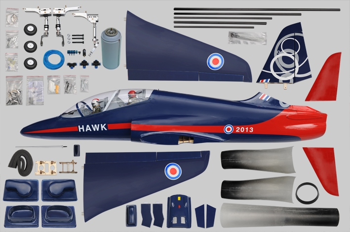Stavebnice obsahuje: potažený trup, křídlo a ocasní plochy, laminátové přívodní "roury" a trysku, pneumatický zatahovací podvozek, sadu drobného příslušenství a obrázkový návod.