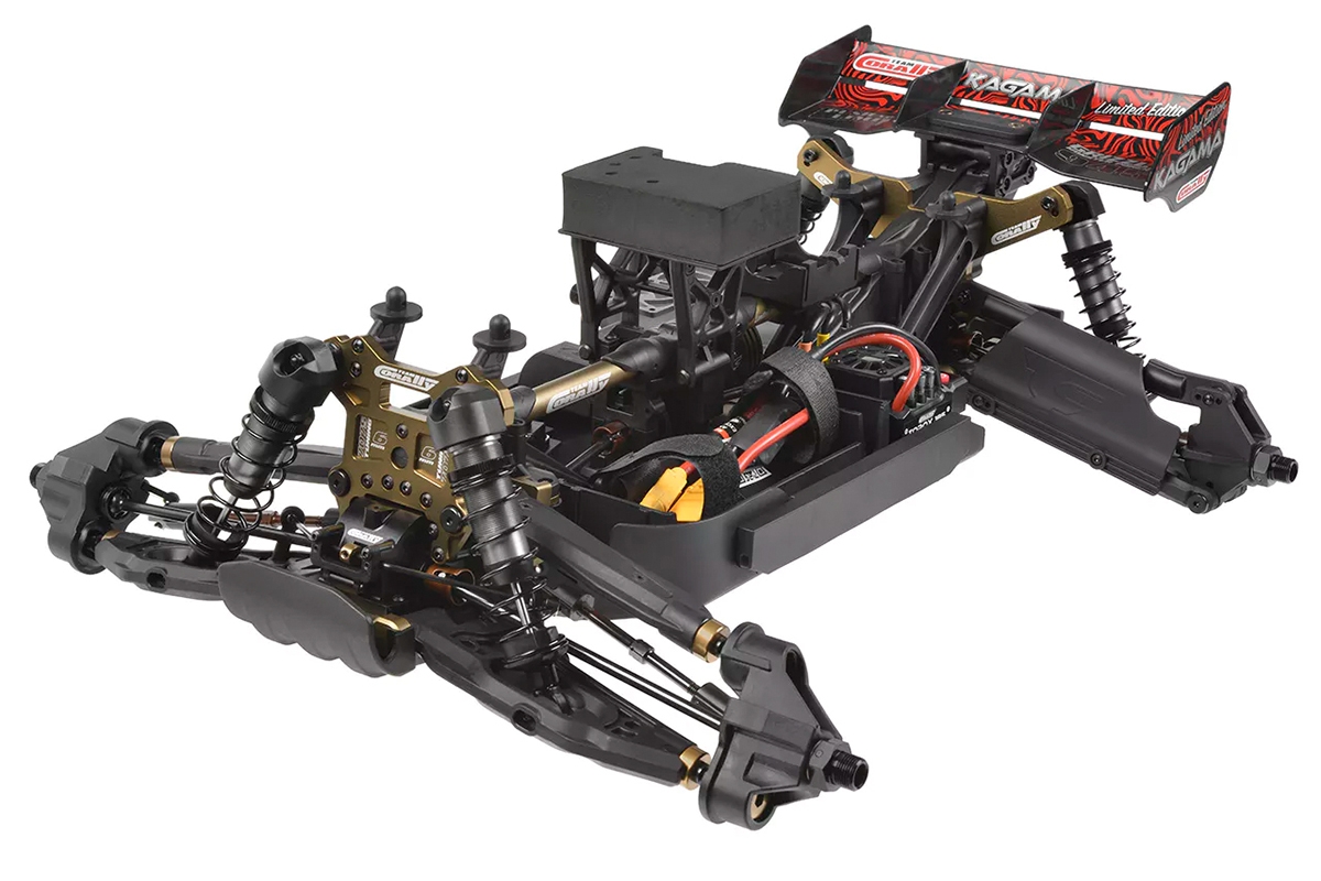 Kagama Limited Edition vylepšuje osvědčený výkon standardního modelu Kagama a zároveň zachovává jeho osvědčené komponenty. Mnoho hliníkových dílů nyní má jedinečnou eloxovanou povrchovou úpravu Limited Edition, díky čemuž je skutečně jedinečný. Podvozek, vzpěry odpružení, středový díl řízení a matice pro nastavení pivot ball čepů nyní mají exkluzivní zlatou povrchovou úpravu. Středový diferenciál, náboje kol, kroužky nastavení předpětí pružin tlumičů a páka serva mají elegantní černou eloxovanou povrchovou úpravu. Všimli jste si jich všech?