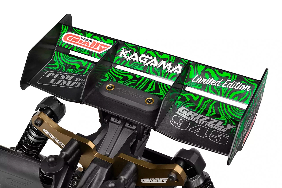 Kagama Limited Edition vylepšuje osvědčený výkon standardního modelu Kagama a zároveň zachovává jeho osvědčené komponenty. Mnoho hliníkových dílů nyní má jedinečnou eloxovanou povrchovou úpravu Limited Edition, díky čemuž je skutečně jedinečný. Podvozek, vzpěry odpružení, středový díl řízení a matice pro nastavení pivot ball čepů nyní mají exkluzivní zlatou povrchovou úpravu. Středový diferenciál, náboje kol, kroužky nastavení předpětí pružin tlumičů a páka serva mají elegantní černou eloxovanou povrchovou úpravu. Všimli jste si jich všech?