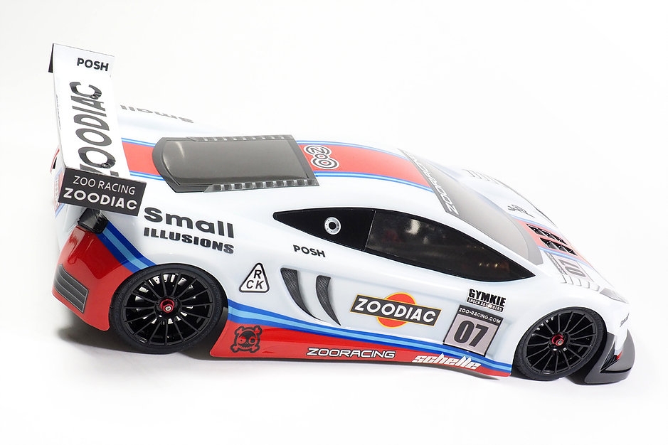 Karoserie Zoodiac GT pro cestovní vozy 190 mm je nejnovější vysoce výkonnou karoserií ZooRacing v měřítku 1/10 a naší první verzí pro třídu GT. Cílem bylo vytvořit stylovou, ale efektivní karoserii s pokročilou aerodynamikou a zároveň nabídnout poněkud zmenšený vzhled, který zajistí, že karoserie splňuje všechna aktuální pravidla třídy GT/USGT. Nejprve jsme začali s nízko posazenou siluetou, ke které jsme přidali vytvarované sekce blatníků, které poskytují dostatek prostoru i pro větší pneumatiky třídy GT, zatímco nízkoprofilová část přední kapoty optimalizuje proudění vzduchu kolem blatníků a směrem k obrovskému čelnímu sklu. Ten je navržen tak, aby nabídl mírný design kabiny pro nejlepší možné proudění vzduchu směrem k zadní části kufru a zadnímu křídlu.