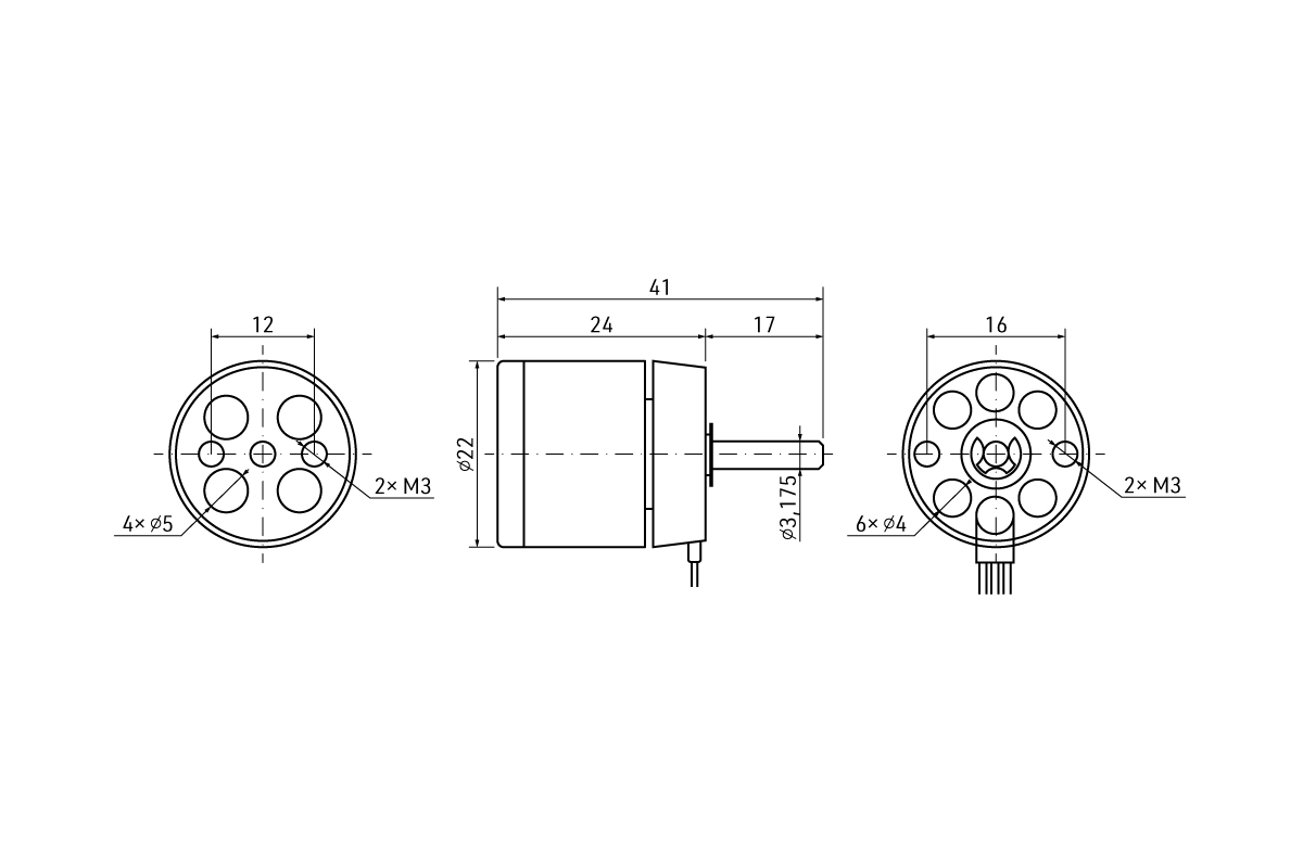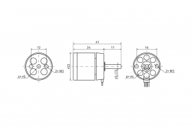Montáž motoru: KAVAN C2225-2000 je konstruován pro přední montáž. Použijte dva šrouby M3, které zasahují do čela motoru v rozmezí 3 - 4 mm. Otvory pro upevňovací šrouby v čele motoru jsou uozmístěny s roztečí 16 mm. Motorová přepážka by měla být z 1,5-2 mm letecké překližky.