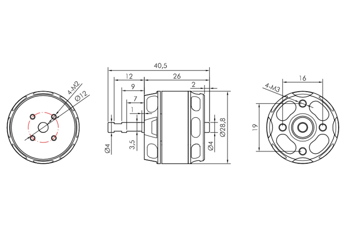 Montáž motoru: KAVAN PRO 2826-1000 je konstruován pro přední i zadní montáž. Při přední montáži za čelo motoru použijte nejméně dva (protilehlé), nebo čtyři šrouby M3, které zasahují do čela motoru v rozmezí 3 - 4 mm. Motorová přepážka by měla být z 2 mm letecké překližky. Sada pro zadní montáž (upevňovací kříž, unašeč vrtule pro zadní montáž) je dodávána spolu s motorem.