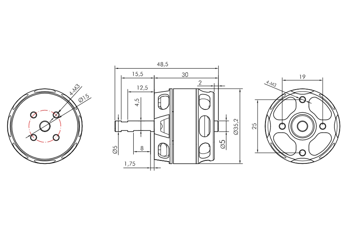 Montáž motoru: KAVAN PRO 3530-1200 je konstruován pro přední i zadní montáž. Při přední montáži za čelo motoru použijte nejméně dva (protilehlé), nebo čtyři šrouby M3, které zasahují do čela motoru v rozmezí 3,5-4 mm. Motorová přepážka by měla být z 3 mm letecké překližky. Sada pro zadní montáž (upevňovací kříž, unašeč vrtule pro zadní montáž) je dodávána spolu s motorem.
