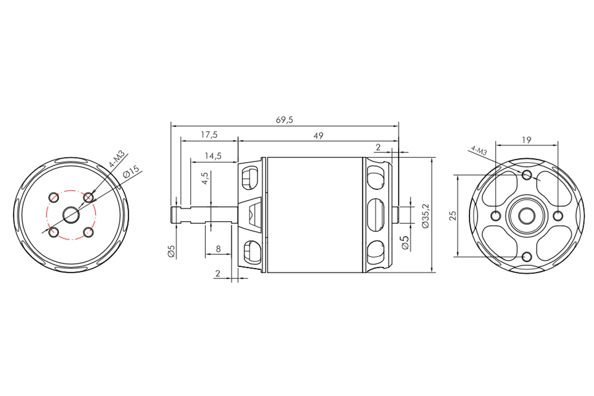 Montáž motoru: KAVAN PRO 3548-750 je konstruován pro přední i zadní montáž. Při přední montáži za čelo motoru použijte čtyři šrouby M3, které zasahují do čela motoru v rozmezí 3,5-4 mm. Motorová přepážka by měla být z 5 mm letecké překližky. Sada pro zadní montáž (upevňovací kříž, unašeč vrtule pro zadní montáž) je dodávána spolu s motorem.