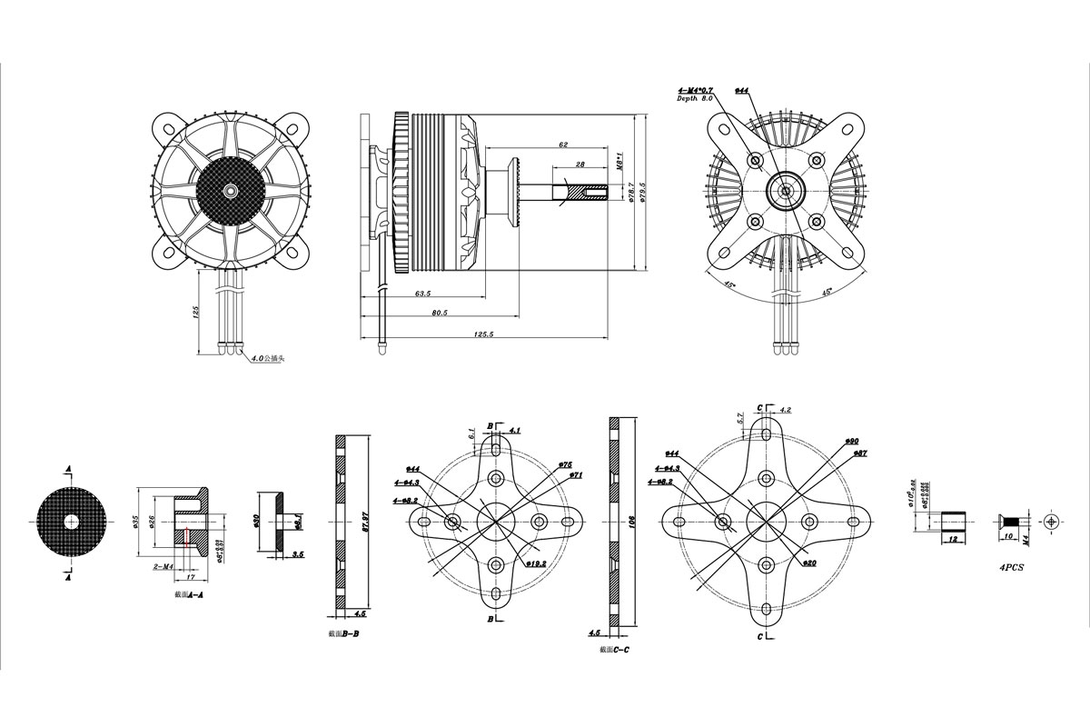 Montáž motoru: KAVAN PRO PRO 8045-215 je konstruován pro zadní montáž. Pro upevnění použijte čtyři ocelové šrouby M4; motorová přepážka by měla být z 8-10 mm letecké překližky.