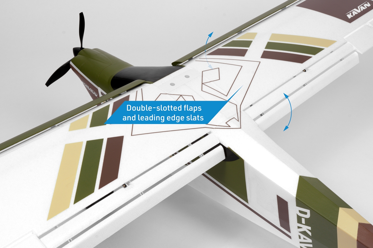 Křídlo modelu z pěnového EPO je dvojdílné s uhlíkovými nosníky a uhlíkovou trubkovou spojkou. Na místě je zajištěno šrouby. Křidélka i dvouštěrbinové Fowlerovy klapky (se spřaženými sloty na náběžné hraně) jsou ovládány nezávisle vždy dvěma servy s krátkými přímými drátovými táhly a nechybí ani funkční poziční LED světla. Snadno demontovatelné uhlíkové vzpěry křídla jsou zajištěny na místě páry drátových sponek.