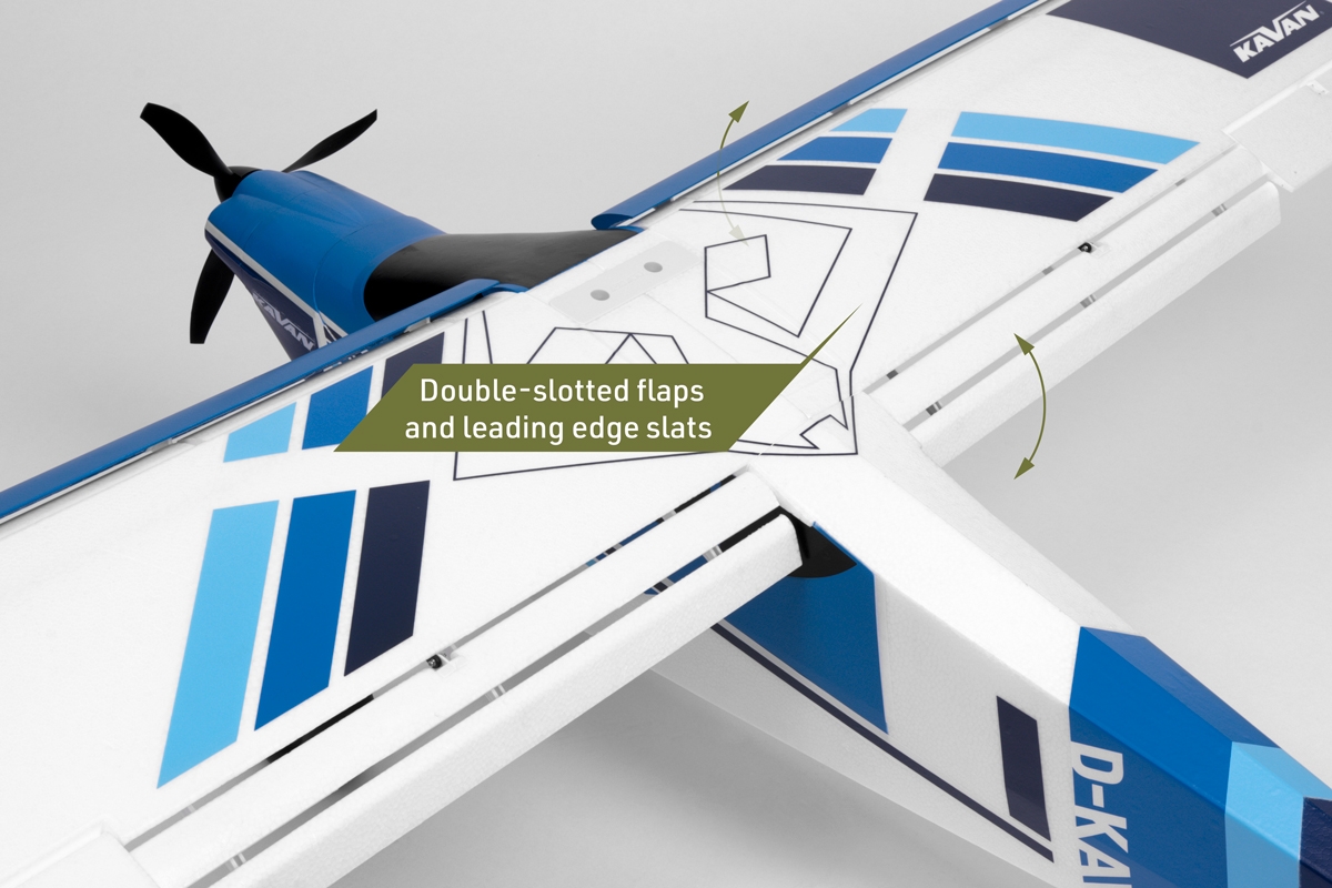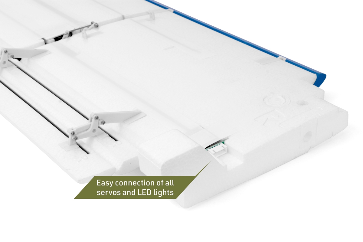 Křídlo modelu z pěnového EPO je dvojdílné s uhlíkovými nosníky a uhlíkovou trubkovou spojkou. Na místě je zajištěno šrouby. Křidélka i dvouštěrbinové Fowlerovy klapky (se spřaženými sloty na náběžné hraně) jsou ovládány nezávisle vždy dvěma servy s krátkými přímými drátovými táhly a nechybí ani funkční poziční LED světla. Snadno demontovatelné uhlíkové vzpěry křídla jsou zajištěny na místě páry drátových sponek.