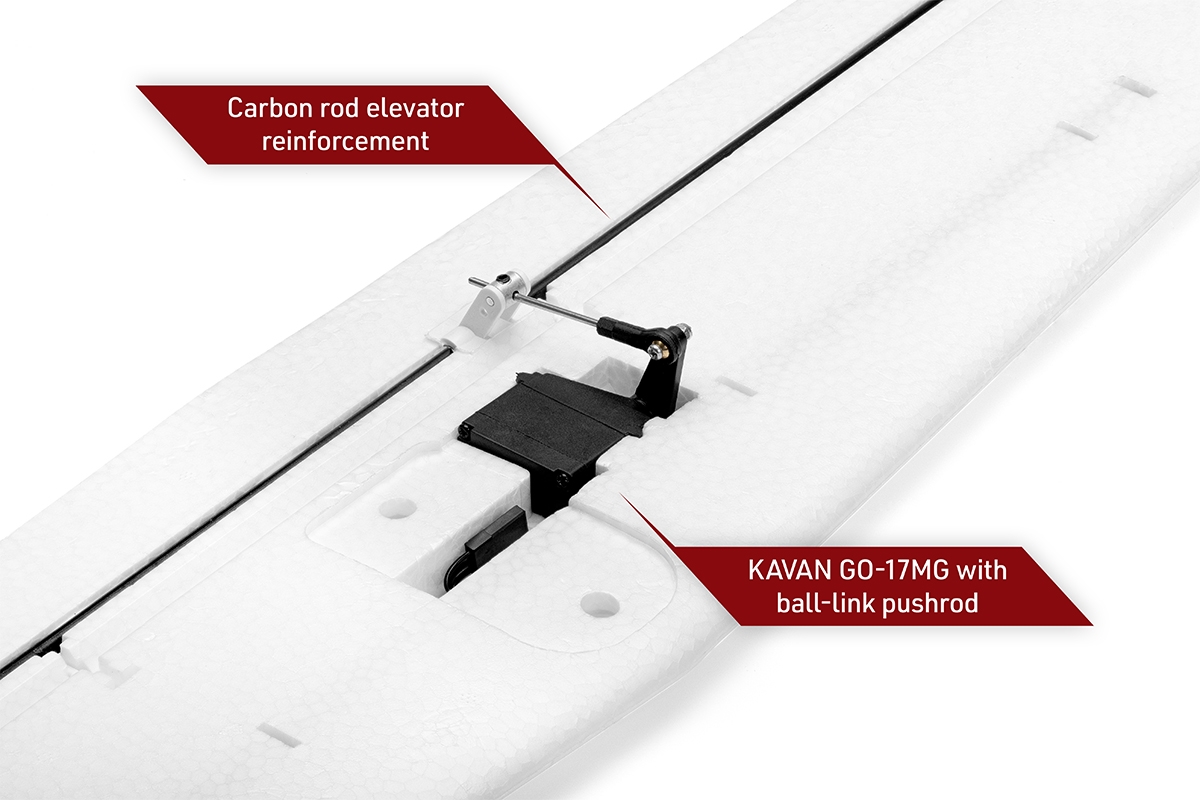 Trup modelu je zhotoven z vysoce odolného pěnového EPO (extrudovaného polyolefinu) s důkladnými vnitřními uhlíkovými výztuhami. V přídi je nainstalován střídavý elektromotor C3548-750 se sklopnou vrtulí 11x8“ a regulátorem KAVAN R-50SB s výkonným BEC stabilizátorem napájení potřebným pro napájení 4 silných mikroserv na palubě. Kryt kabiny je odnímatelný, upevňuje se pomocí čepu vpředu a magnetu vzadu. V přídi najdete dostatek prostoru pro pohonný akumulátor a přijímač. Serva směrovky a výškovky jsou uložena v kýlovce, kormidla ovládají krátkými přímými drátovými táhly.