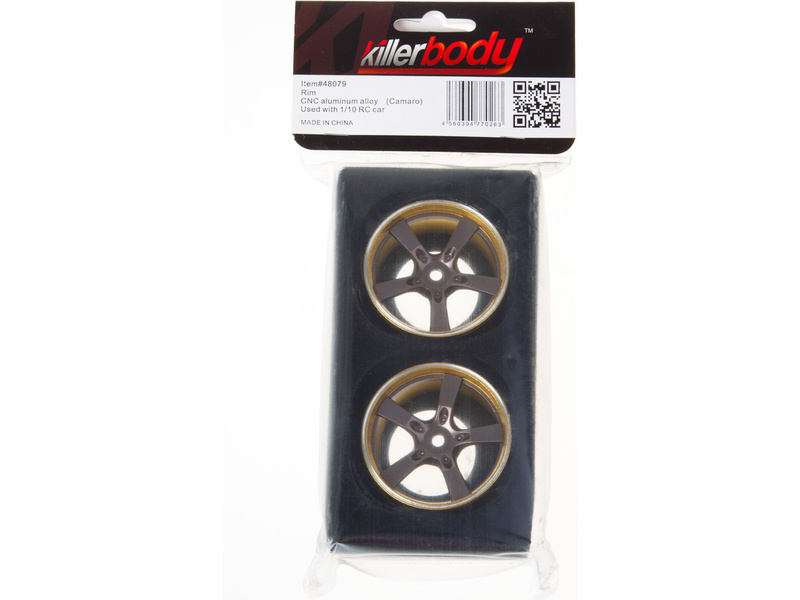 Tuningové hliníkové disky od Killerbody pro RC modely aut 1:10. Disky jsou vyrobeny z hliníku, mají šedou barvu a zlatý ráfek. Licencovaný design Camaro 2011. Balení obsahuje 2 disky.