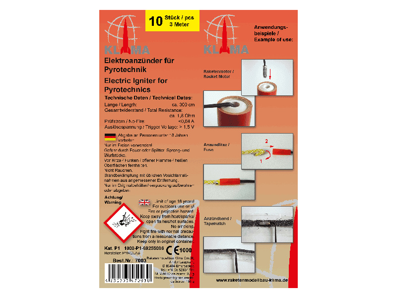 Elektrický palník Klima extra dlouhý - 3 metry, pro raketové motory. V balení je 10 ks. Elektrickým palníkem lze bezpečně odpálit raketový motor pro snadnou manipulaci a bezpečný start rakety.