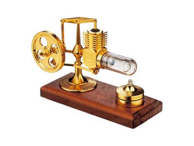 Stirlingův motor typu Beta, provedení Krick Motor Stirling zlatý smontovaný. Píst a ložisko výtlačného pístu jsou vyrobeny ze speciální, samomazného materiálu. To znamená, že žádnou údržbu a dlouhou životnost. Palivo je denaturovaný líh, dlouhá doba provozu. Vyroben z pozlacené mosazi. Délka celk. 155mm, šířka 60mm, výška 105mm.