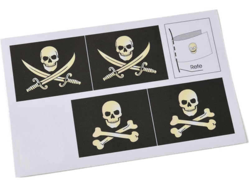 Pirátská vlajka natištěná na samolepící tkanině (2 ks). Rozměr vlajky je cca 55x43 mm.