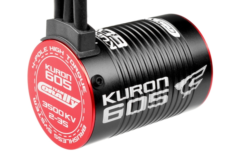 TEAM CORALLY KURON 605 střídavý motor bezsenzorový. Provozní napětí: 5-12,6V, délka samotného těla 52mm, průměr: 36mm, váha: 205g, otáčky na 1Volt: 3.500 o/min, hřídel 3,17mm, 4 polový, délka samotné hřídele 15mm.