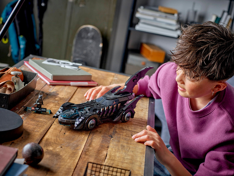 Tato autentická replika kultovního vozu z filmu Batman navždy obsahuje tvarované čelní sklo, pohyblivá kola, dekorace a otevírací kokpit, který odhaluje propracovaný interiér. Součástí vozidla je také minifigurka Batmana s vlastním speciálním podstavcem. Pro ještě větší porci digitální zábavy stavitelé můžou přibližovat a otáčet modely ve 3D a sledovat pokrok pomocí zábavné a intuitivní aplikace LEGO Builder. Stavebnice obsahuje 909 dílků.