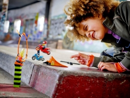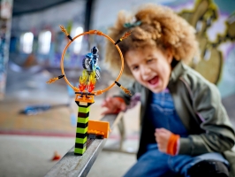 - Děti nastartují motorky se setrvačníkem a skočí z rampy tak, aby trefily ohnivý kruh. Když se jim to podaří, mohou skok prodloužit nebo umístit kruh ještě výš, ať to není tak jednoduché!