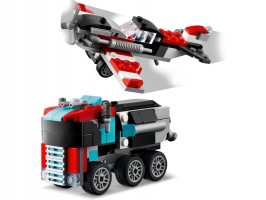 Malí stavitelé si s touto stavebnicí z řady LEGO® Creator 3 v 1 poskládají hned 3 různé dvojice modelů. Nejprve si postaví třeba náklaďák s plochou korbou a helikoptéru, pak modely přestaví na vrtulové letadlo a náklaďák s palivem s otáčecími koly a pak se vydají na závody s modely hot rodu a SUV – nebo si postaví vlastní originální vozidla.