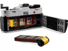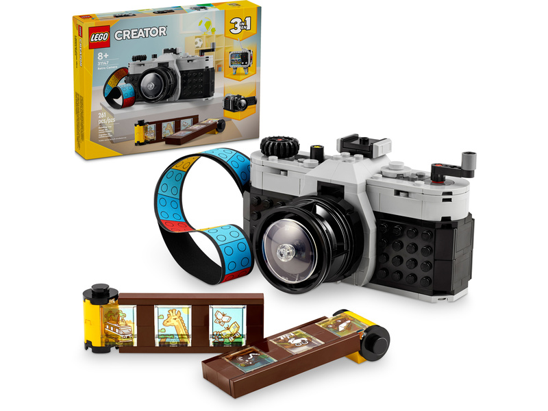 Inspirujte děti od 8 let k nápaditému hraní se stavebnicí LEGO® Creator 3 v 1 (31147) Retro fotoaparát. Model fotoaparátu má pohyblivý objektiv, na horní straně najdete tlačítka k pořízení fotografie a vzadu je otvor, do kterého můžete umístit film z kostek a barevný textilní pásek na nošení. Součástí je také 6 samolepek, které představují fotografie a děti je nalepí na jednotlivá filmová políčka.
