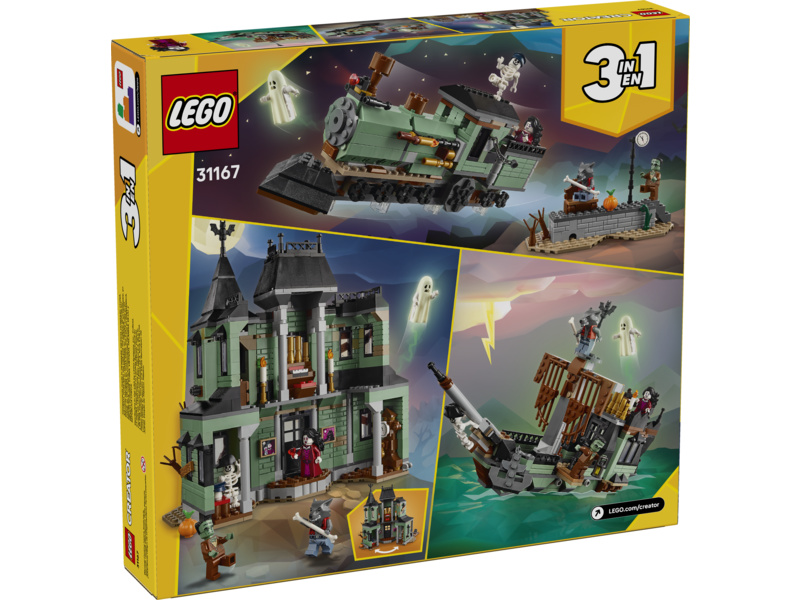 Vyprávějte strašidelné příběhy se stavebnicí LEGO® Creator 3 v 1 (31167) Strašidelný dům. Dvoupatrový strašidelný dům je nabitý úžasnými detaily a funkcemi, včetně otevírací přední brány, hřbitova, odpojitelného strašidelného stromu, varhan, skrytého ducha, kterého odhalíte otočením kola, a otevíracího zadního dílu pro ještě více herních možností.