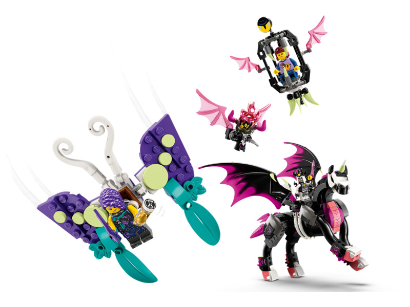 Tato stavebnice LEGO® DREAMZzz™ (71457) Létající kůň pegas vtáhne děti od 8 let přímo do akce ve Světě snů. Podobně jako v televizním seriálu se tu odehrává příběh Zoey a její záchranné mise za kamarádkou Novou, kterou unesla noční můra Susan na létajícím koni pegasovi. Návod na stavění vedený příběhem vtáhne děti do akce a podnítí jejich představivost při rozhodování o tom, co Zoey podnikne.