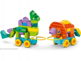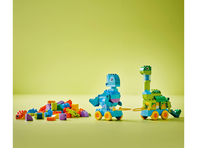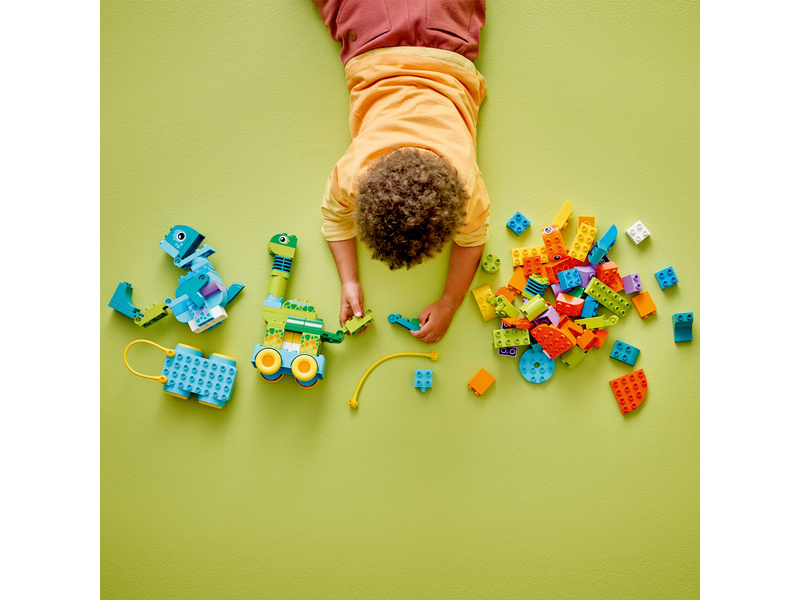 108 kostek a dílků v této stavebnici LEGO® DUPLO® se zvířátky lze sestavit 3 různými způsoby: Diplodocus a T-rex, triceratops a stegosaurus nebo pteranodon a parasaurolophus. Děti si můžou vytvořit ještě zábavnější figurky přidáním pohyblivého krku a ocasu, křídel nebo tlamy, kterou lze otvírat a zavírat. Dinosaury lze umístit na podložku s kolečky, takže stavebnice potěší všechny malé milovníky vozidel LEGO DUPLO.