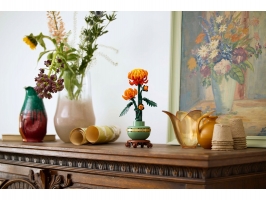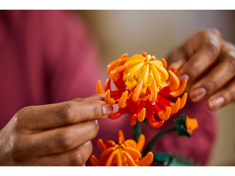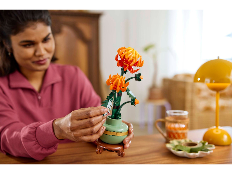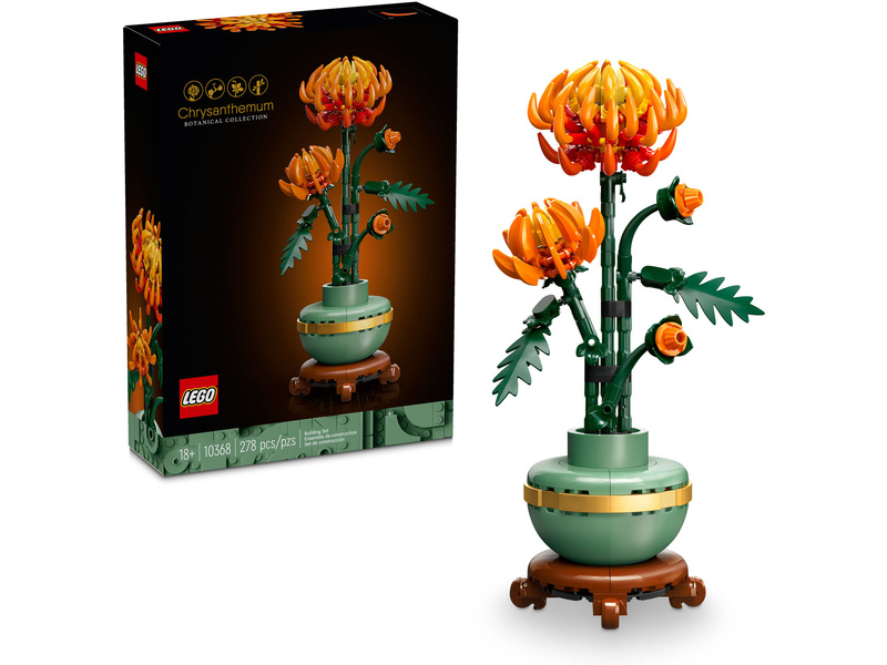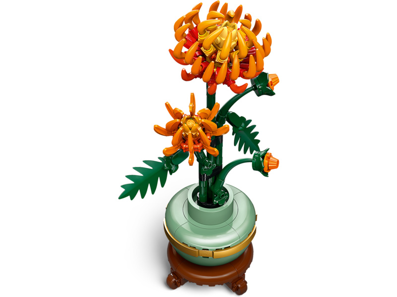 Tato propracovaná replika s polohovatelnými listy a okvětními lístky představuje zářivě oranžový květ v různých fázích kvetení – poupě, kvetoucí květ a květ v plném rozkvětu. Součástí je také pastelově zelený květináč zdobený zlatým páskem, který je umístěný na podstavci s efektem dřeva. Model chryzantémy se snadno sestavuje, představuje elegantní ozdobu každé místnosti a bude se skvěle vyjímat vedle dalších stavebnic z botanické kolekce LEGO (prodávají se samostatně).