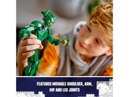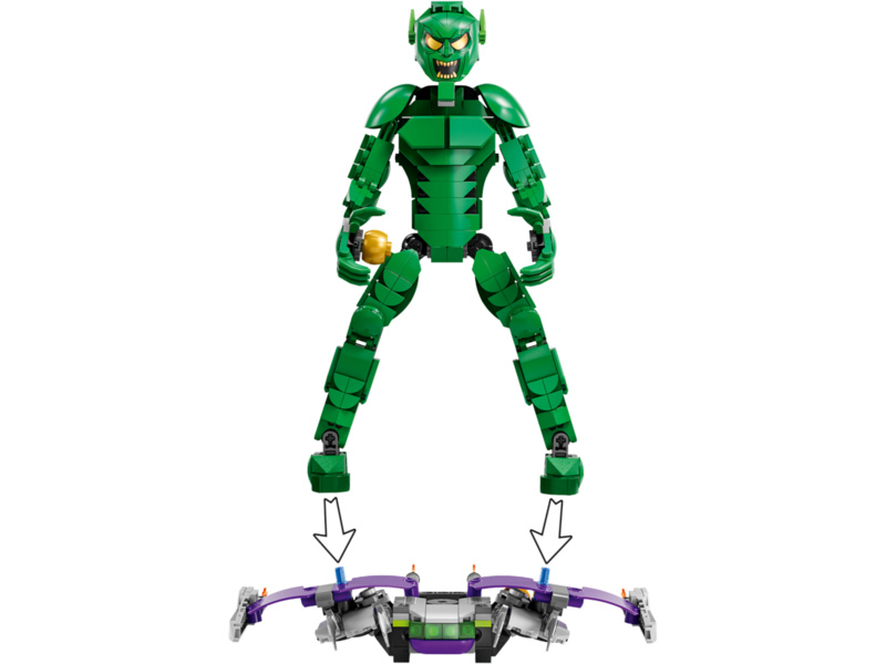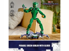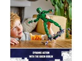 Tento sběratelský model padoucha ze světa Marvel představuje zábavný dárek pro malé superhrdiny, kteří se s ním mohou těšit na stavění, hraní i vystavování. Figurka má pohyblivé klouby ramen, paží, kyčlí a nohou, takže s ní děti vytvoří parádní akční pózy a vydají se na napínavé mise. Propracovaný Zelený Goblin má 2 dýňové bomby a slavný kluzák. Bomby lze vložit do rukou postavy nebo do úložného prostoru v zadní části kluzáku. Hračka je ideální pro nezávislé hraní rolí. Pro ještě více digitální zábavy stavitelé mohou přibližovat a otáčet stavebnice ve 3D a sledovat svůj pokrok v intuitivní aplikaci LEGO Builder.