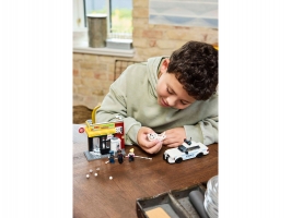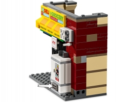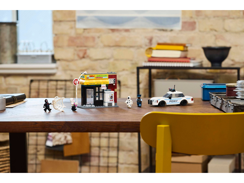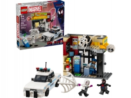 Stavebnice se Spider-Manem obsahuje 4 minifigurky: Milese Moralese, Fleka, Gwen Stacyovou a strážníka Jeffersona. Samoobsluha má zeď s funkcí výbuchu, která umožňuje vyjmutí bankomatu. Mezi doplňky najdete dlouhé, pružné pavučinové lano a pružnou pavučinu, do které se vejde i minifigurka. Policejní auto lze otevřít a dovnitř umístit 2 minifigurky. Stavitelé můžou přibližovat a otáčet modely ve 3D a sledovat svůj pokrok pomocí zábavné a intuitivní aplikace LEGO Builder pro ještě větší porci digitální zábavy.