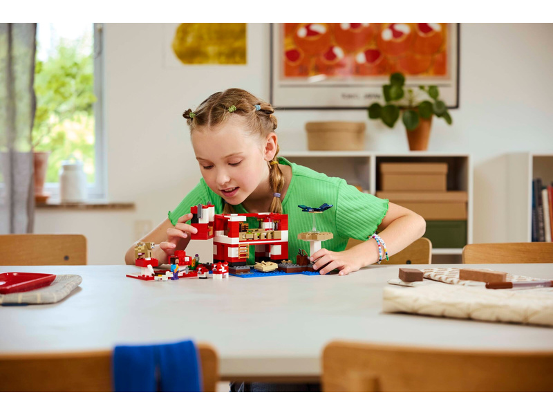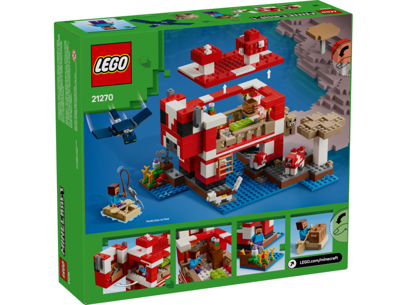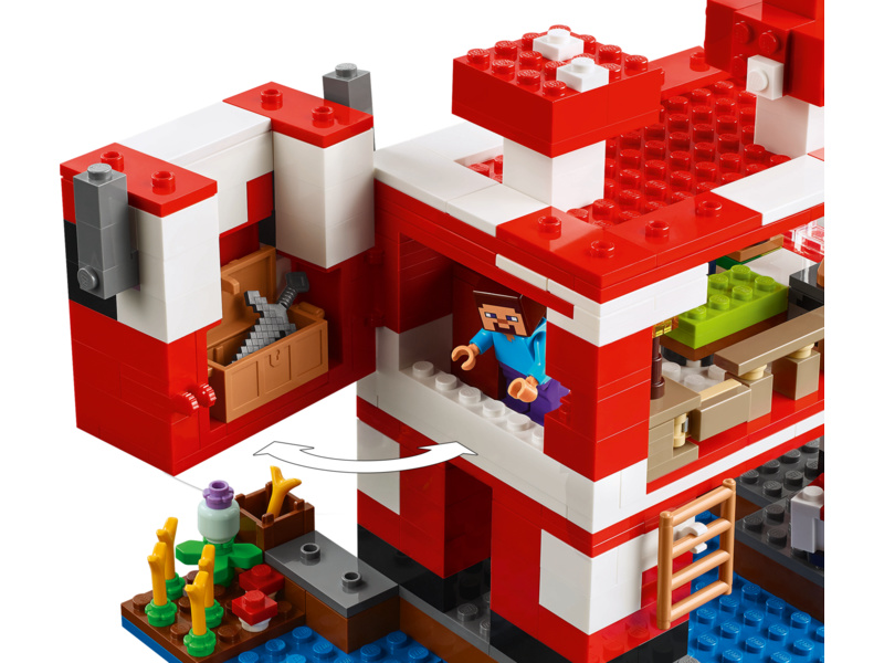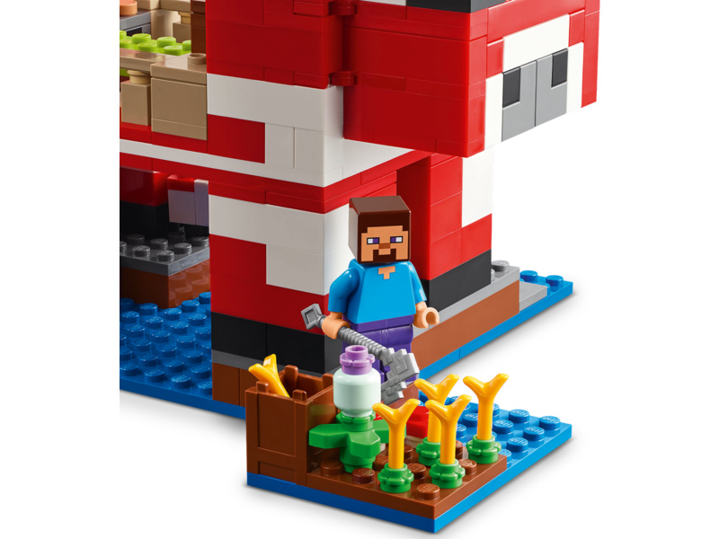 Tato stavebnice LEGO Minecraft se nachází na houbovém ostrově a obsahuje oblíbenou postavu Steva, červenou krávomůrku, malou červenou krávomůrku, hnědou krávomůrku, tříbarevnou kočku a nepřátelský létající přízrak. Stavebnice je plná prvky, které se objevují ve hře, včetně malé farmy s pšenicí, houbami a rostliny rostoucí vedle kompostéru. Mezi doplňky najdete rybářský prut, tresku, motyku, netheritový meč, misku, loďku s vesly, truhlu, pec, pracovní stůl, knihovnu, chléb a postel. S aplikací LEGO Builder si děti užijí ještě větší porci zábavy. Umožní jim na jejich zařízení přibližovat a otáčet modely ve 3D.