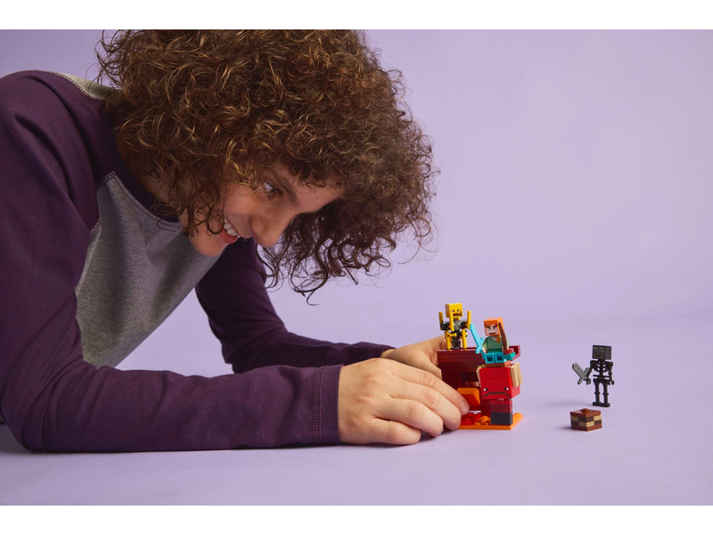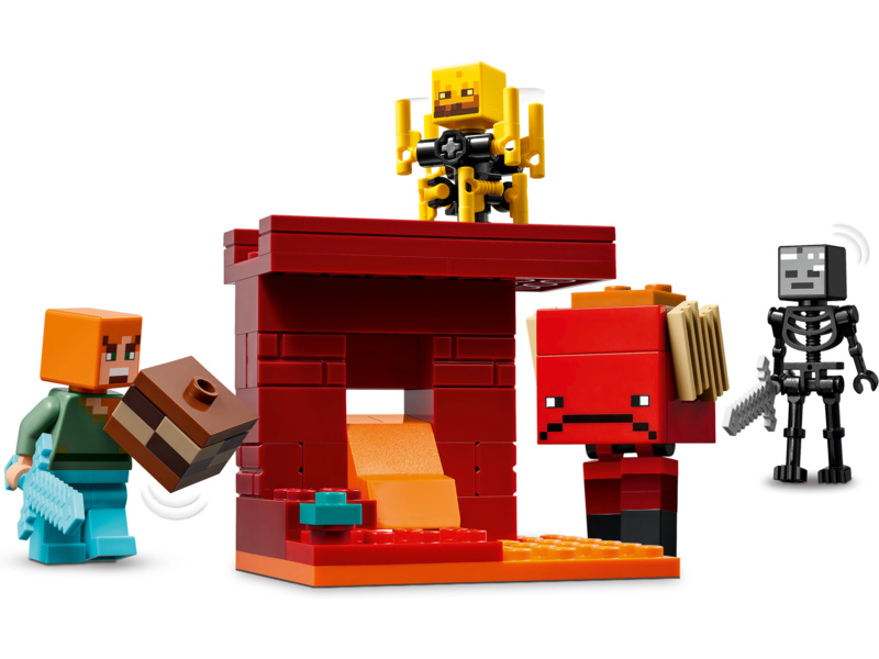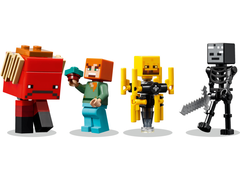 Děti se připojí k akční hrdince Alex z Minecraftu a společně odstraní starobylé trosky z části mostu z pevnosti v Netheru v karmínovém lese. Až trosky odstraníte, prvky lávy se začnou automaticky řídit dolů a figurky z Minecraftu – wither kostlivec s kamenným mečem a blaze s točící se tyčí – zablokují Alex východ. Děti budou bojovat s moby pomocí slavného diamantového meče a pak utečou na další figurce z Minecraftu, chodci s pohyblivýma nohama a sedlem. Hráči musí získat podivné houby, aby mohli chodce řídit. Pro ještě větší digitální zábavu umožňuje aplikace LEGO Builder dětem přibližovat a otáčet modely ve 3D pomocí jejich zařízení.