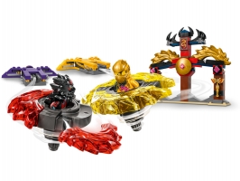 Děti si vychutnají napínavé dobrodružné souboje dobra proti zlu s Arinovým žlutým spinnerem a Rasovým červeným spinnerem, které mají odnímatelné dílky síly. Tyto postavy ze světa NINJAGO můžou své spinnery vylepšovat zlatými prvky, které můžou vyhrát zasažením a zničením bojové arény.