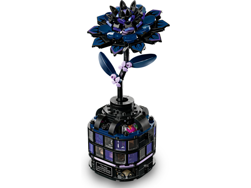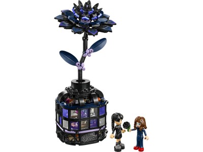 Stavebnice LEGO® Wednesday (76784) Černá jiřina představuje elegantní výstavní kousek pro milovníky botaniky a designu od 9 let. Tato bytová dekorace obsahuje černou jiřinu s listy a světle fialovými pupeny a vázu, která připomíná miniaturní zimní zahradu. Po sestavení můžou děti odejmout květ jiřiny, odemknout vázu a odhalit učebnu uvnitř, ve které najdou odnímatelné lavice, stoličku a další doplňky pro vyprávění příběhů. Součástí stavebnice jsou také minipanenky Wednesday Addamsové a profesorky Marilyn Thornhillové na hraní na postavy.
