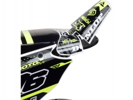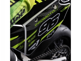 Žádný supermoto stroj by nevypadal dobře bez pořádné grafiky. Promoto-SM má veškeré díly – přední blatník, poznávací značku, chrániče vidlice, přední a zadní boční panel i zadní blatník – vše je zbarveno v oficiálně licencované vinylové grafice.