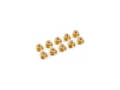 Samojistná hliníková matice M3 s přírubou zlatě eloxovaná. Balení obsahuje 10 ks.