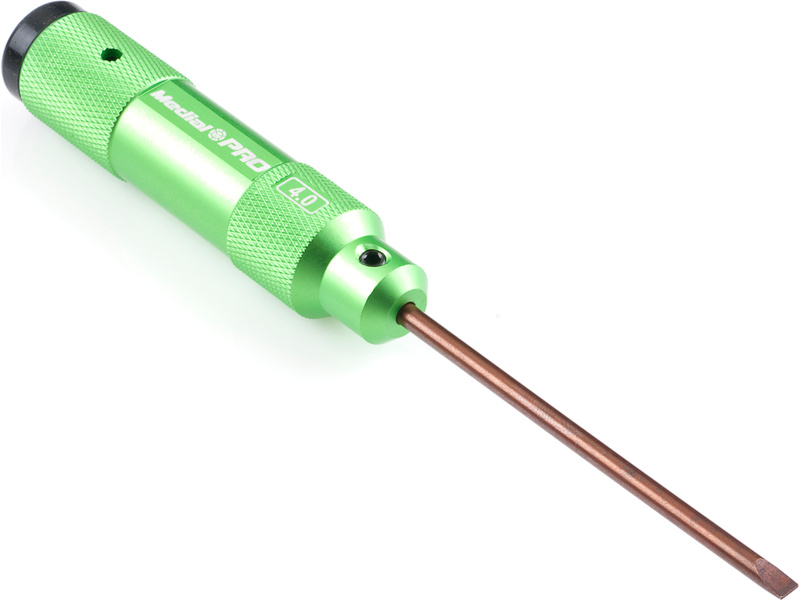 Kvalitní CNC plochý šroubovák Medial Pro o velikosti 4.0 mm má hliníkovou rukojeť o délce 97 mm, průměru 21 mm s gumovou opěrkou a dřík o délce 83 mm. Atraktivní balení v plastové krabičce.