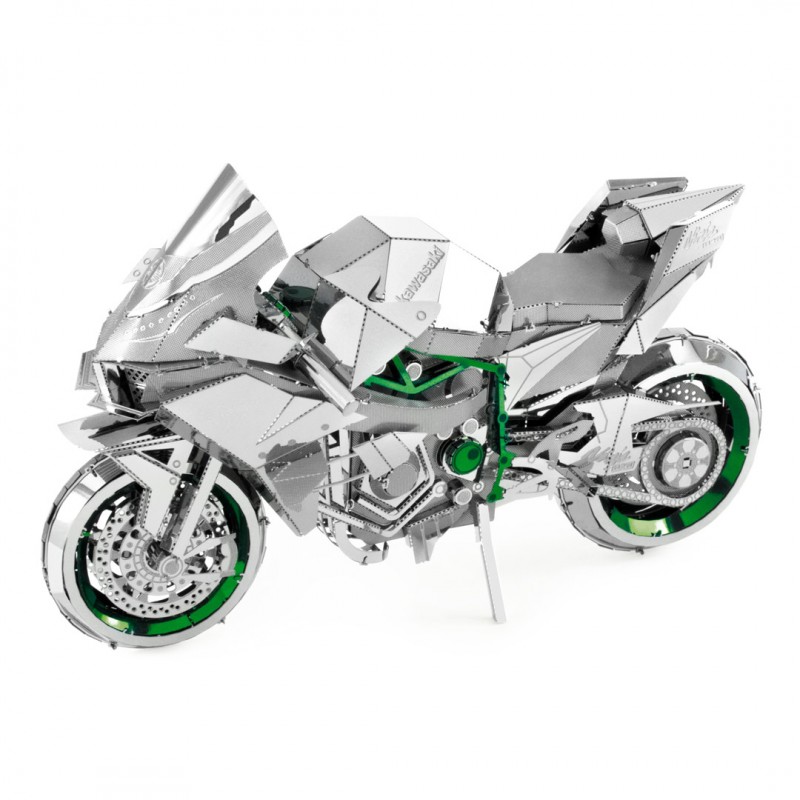 Luxusní 3D ocelová stavebnice Prémiová řada Kawasaki Ninja Green ICX145. 2 kovových destiček ICONX (10 x 20 cm), počet dílů: 105.