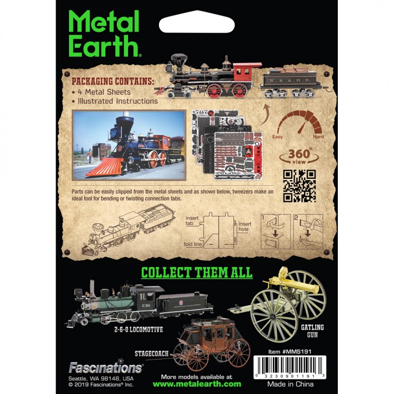 Luxusní 3D ocelová stavebnice Wild West 4-4-0 Lokomotiva. 4 kovové destičky ICONX (11 x 11 cm), počet dílů: 150.
