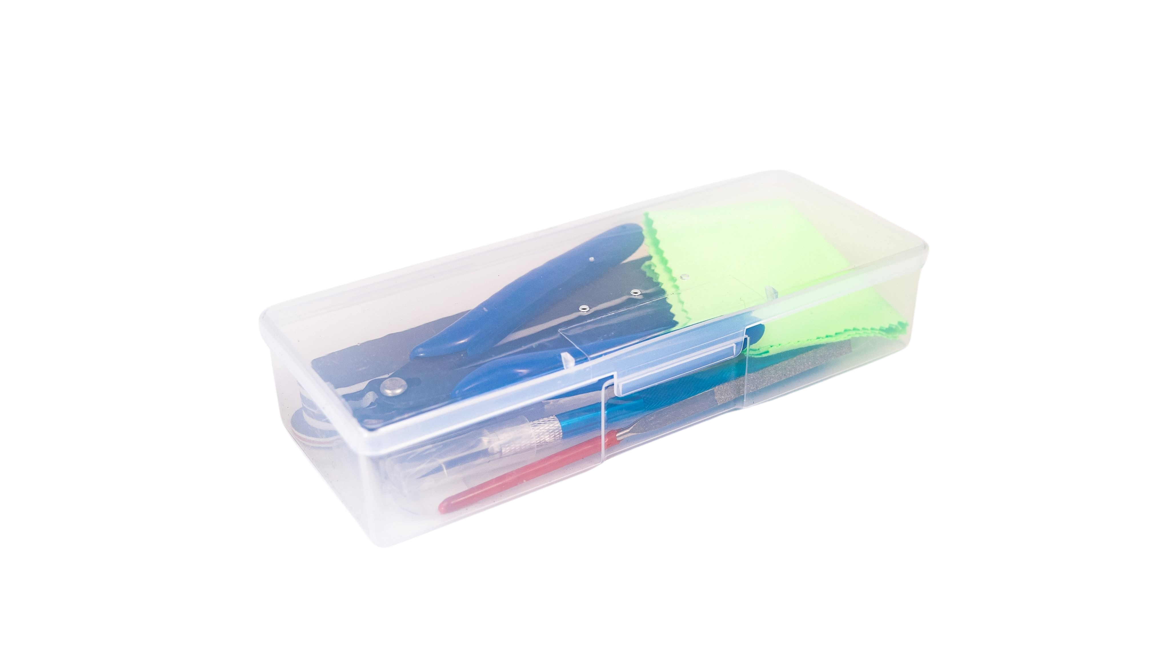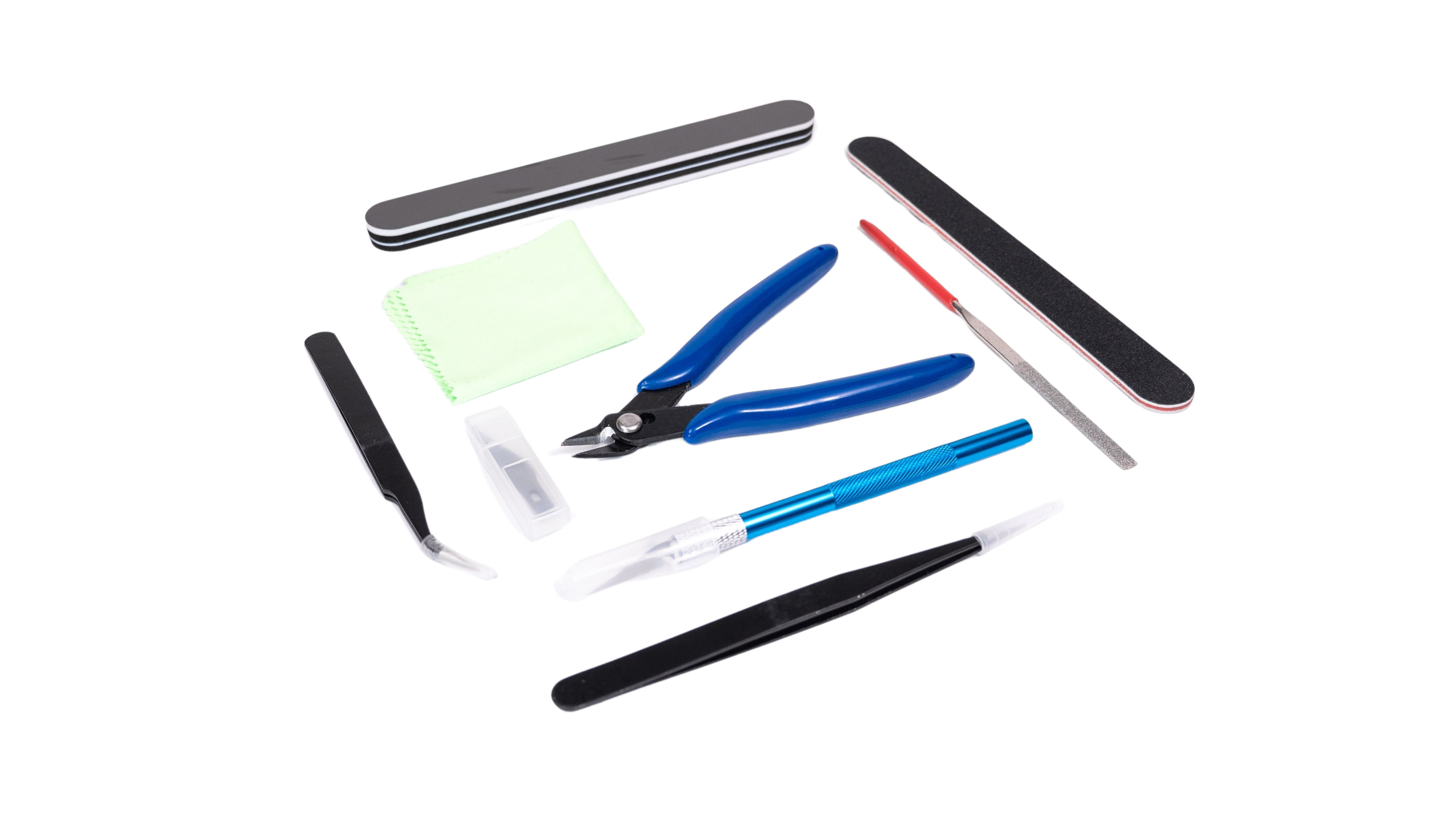 Sada nářadí k ocelovým stavebnicím. 1 x boční kleště, 2 x pinzeta, 1 x pilník, 2 x oboustranná leštěná tyč, 1 x nůž s 5 ks čepele, 1 x průhledná krabice.