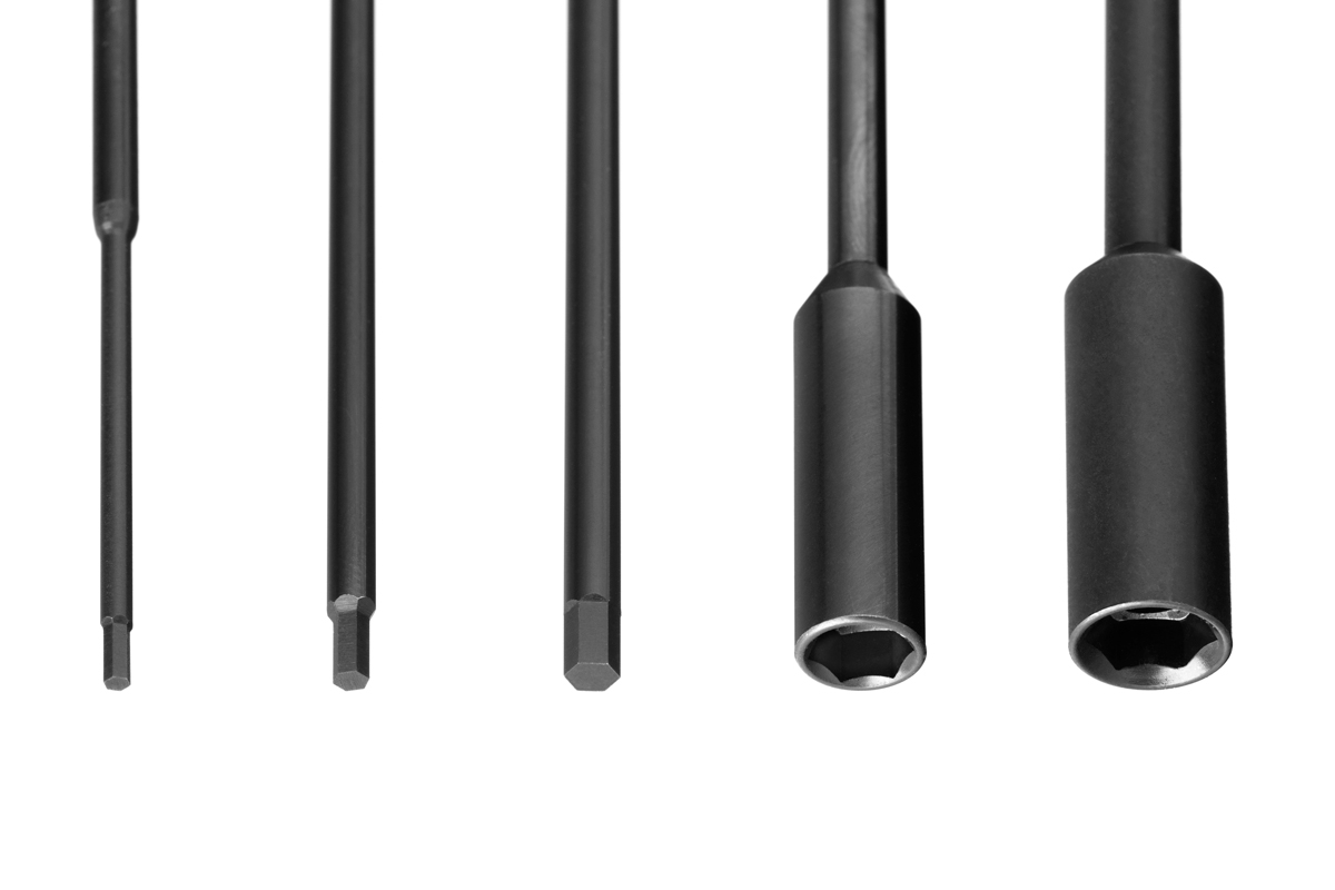 Sada obsahuje černé šroubováky s karbonovou rukojetí velikosti 1.5, 2.0, 3.0mm hex (imbus) a 5.5, 7.0mm nut (nástrčkové).