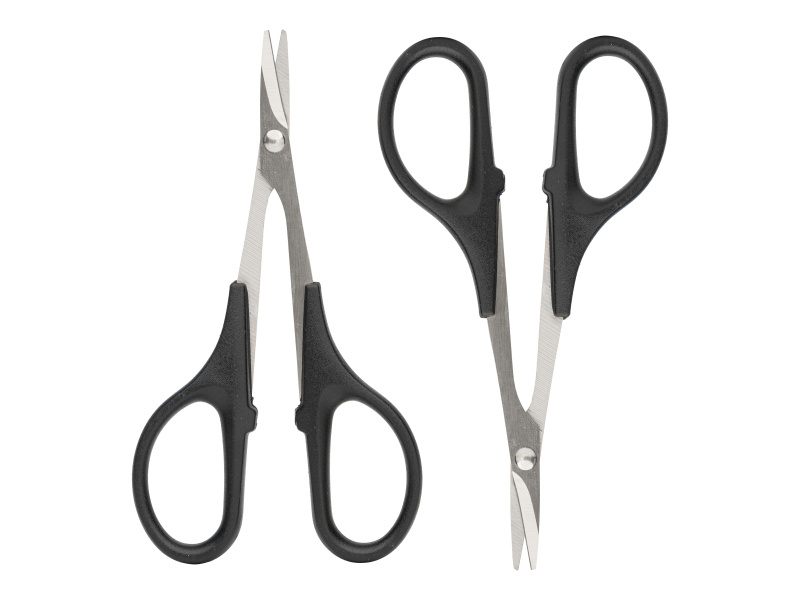 Modelcraft nůžky sada - rovné a zahnuté. Silné ocelové čepele. Ideální pro ostré a přesné řezy lexanových karoserií, plastů a polykarbonátu. Zakřivené nůžky usnadňují vytváření hladkých oblých řezů, zatímco rovné nůžky jsou ideální pro přímé řezy a ořezávání přebytečného materiálu.