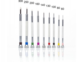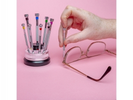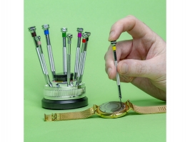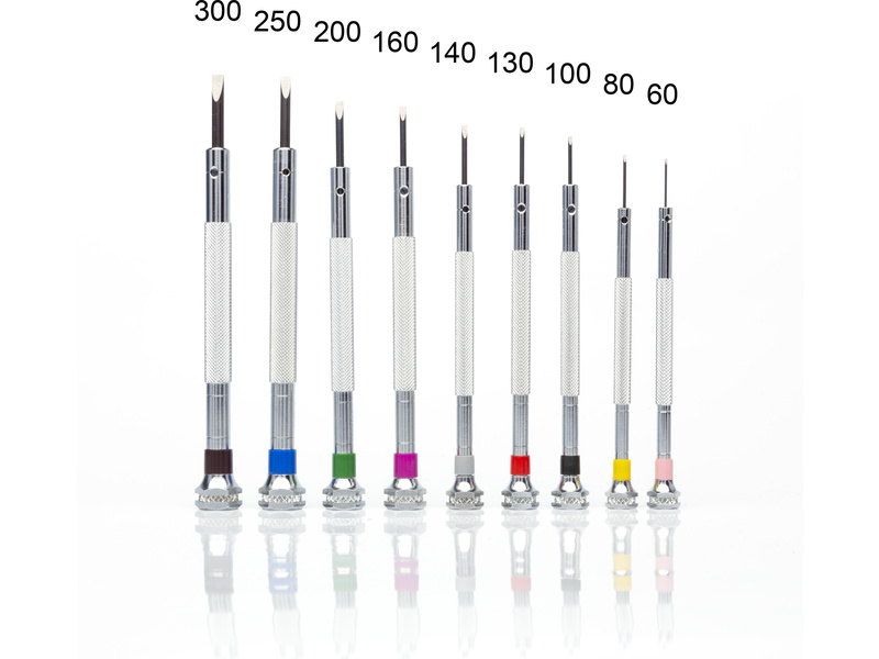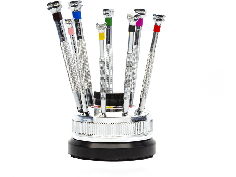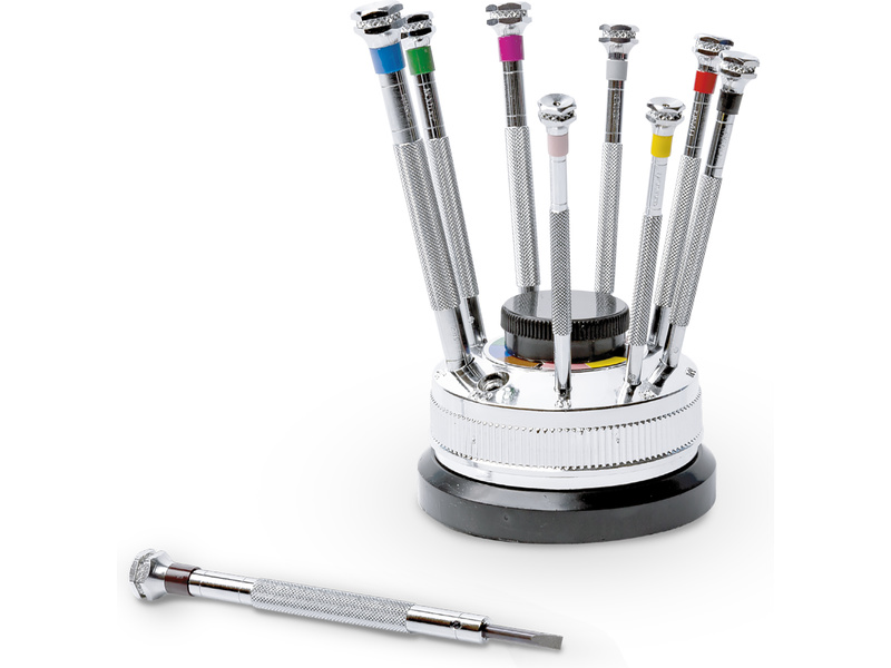 Modelcraft sada 9 ks precizních hodinářských plochých šroubováků s rýhovanými a barevně označenými kovovými těly. Součástí je otočný stojan a náhradními dříky šroubováků uloženými uvnitř stojanu. Velikost (šířky) šroubováků jsou 0,6, 0,8, 1,0, 1,2, 1,4, 1,6, 2,0, 2,5 a 3 mm. Ideální pro přesnou práci, např. hodinářství, jemné elektronice, a podobně.