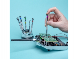 Otočný stojánek má gumovou rýhovanou protiskluzovou podložku, otočná vrchní část má jednotlivé otvory barevné značeny shodně s typem šroubováku, který přísluší dané pozici. Pod plastovou krytkou uprostřed jsou náhradní dříky, větší čtyři po jednom kuse, měších pět po 3 kusech.