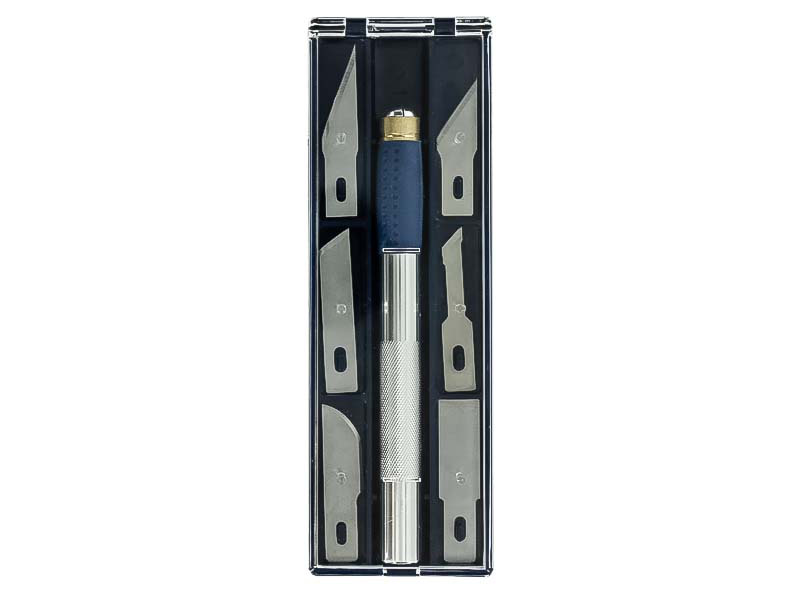Modelcraft profesionální modelářský nůž velký, držák #2, 6ks čepelí. Tato 7dílná sada obsahuje: Kvalitní rukojeť s vestavěným měkkým pohodlným držadlem, magnetický konec pro zvedání čepelí nebo jiných kovových součástí, 6ks čepelí #2, plastový box. Pro řemeslníky, modeláře a profesionály.