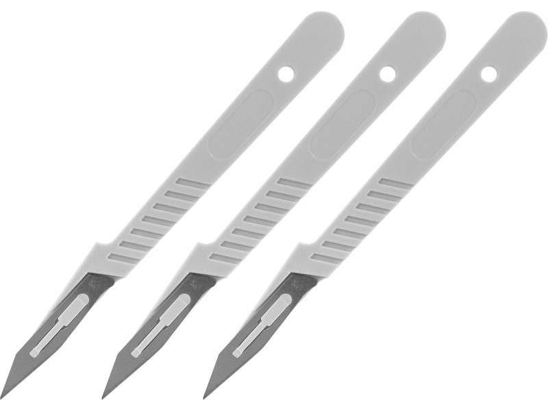 Modelcraft jednorázový skalpel s rukojetí 3ks v balení pro jemné řezy, které jsou potřeba při speciální modelářské a kutilské práci. Dodává se s nylonovou rukojetí, vestavěným chráničem prstů a bezpečnostní čepičkou. Jednorázové použití. Délka 150mm, šířka 15mm.